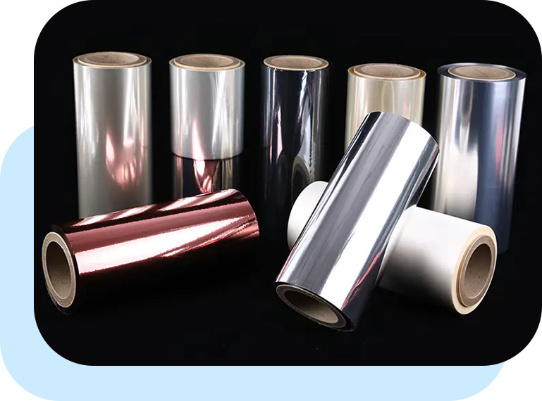 8 منتجات شاملةأفلام معدنية مختلفة (VMPET/VMCPP/VMBOPP) ، فيلم طلاء (PVDC/Acrylic/PVA) ، فيلم Alox Caoted (ALOX PET من أجل التصفيح/الطباعة) ، الابتكار المستمر للمنتجات الجديدة والراقية. .